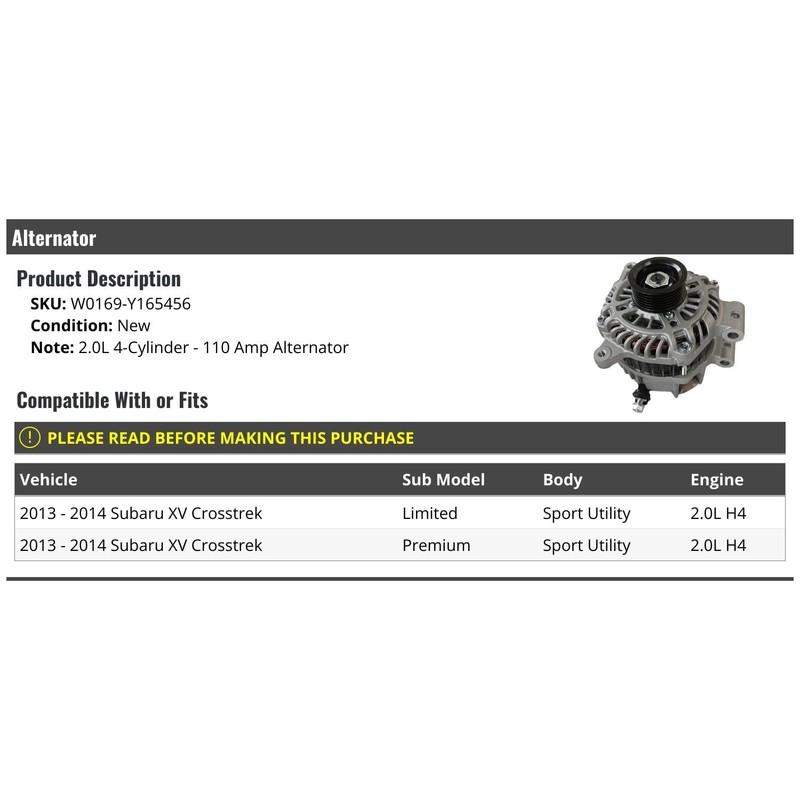 Alternator - 110 Amp - Compatible with 2013 - 2014 Subaru XV Crosstrek Sport Utility 2.0L H4