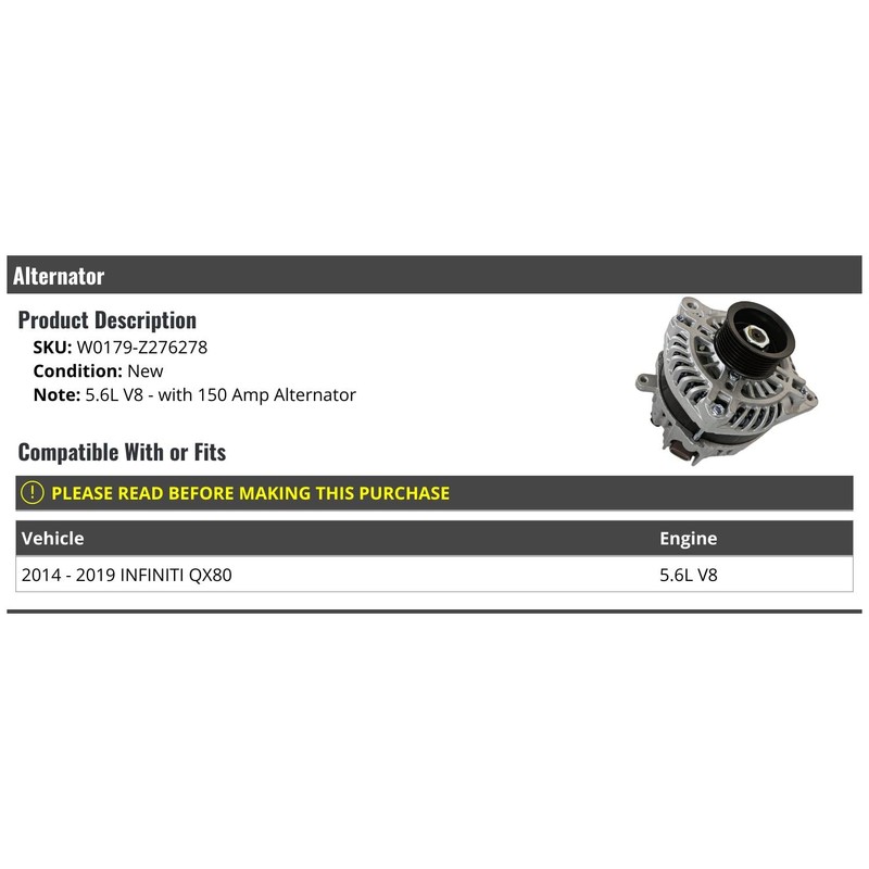 Alternator - 150 Amp - Compatible with 2014-2019 Infiniti QX80 5.6L V8