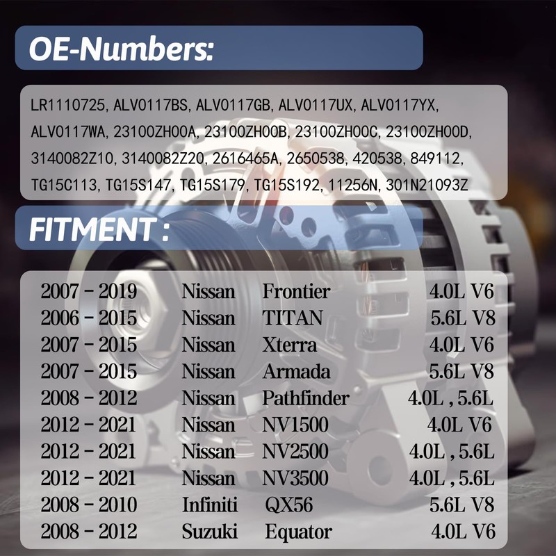 - 【Vehicle Fitment-1】: Car Alternator Compatible with Nissan Frontier 2007-2019 4.0L V6,Compatible with Nissan TITAN 2006-2015 5.6L V8,Compatible with Nissan Xterra 2007-2015 4.0L V6,Compatible with Nissan Armada 2007-2015 5.6L V8,Compatible with Nissan Pathfinder 2008-2012 4.0L , 5.6L