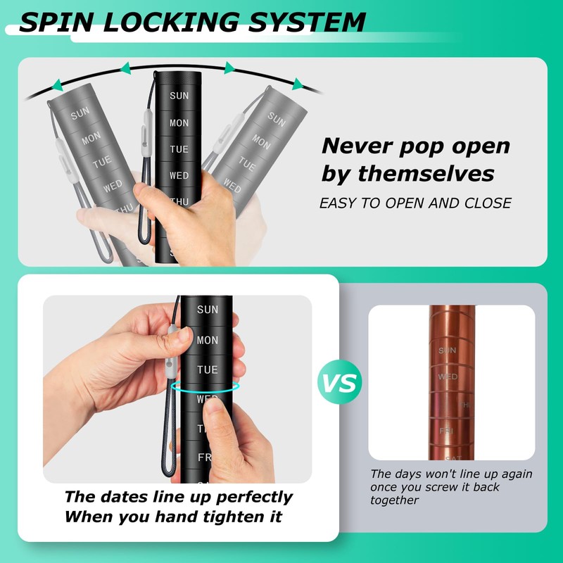 - 【BEST FOR ON THE GO TRAVLE】Rotating locking design to help lock your medicine safely and easy to open and refill.After being locked, it will stay closed, won't pop-open or spill out accidently in your handbag, suitcase, backpack,purse when traveling.Stackable detachable supplement organizer allows you to take only the days you need.save much more room traveling makes you easily enjoy your journey .