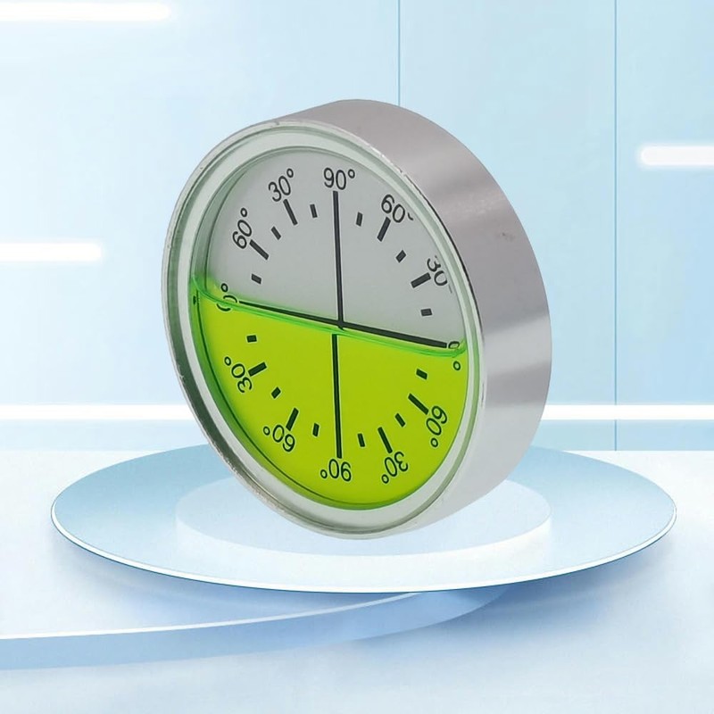 - The measurement range is 0-90 degrees in both directions, with a resolution of 15 degrees per quarter, and the liquid is clearly visible.