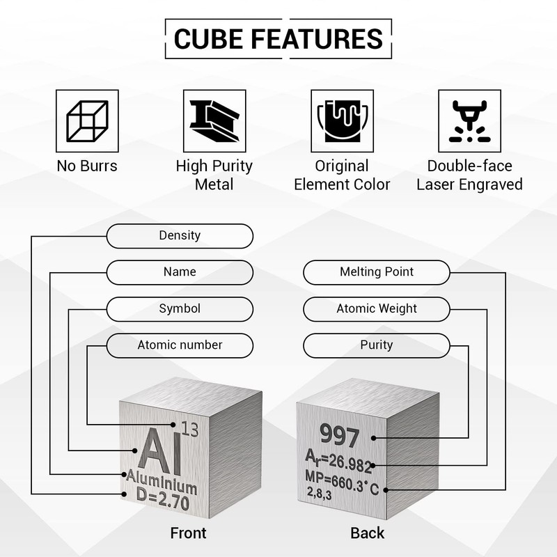 • LASER ENGRAVED: Each cube is engraved with the Chemical Symbol, Name, Atomic Number, Density, Purity, Atomic Mass, Melting Point, and Electronic Shell Structure.