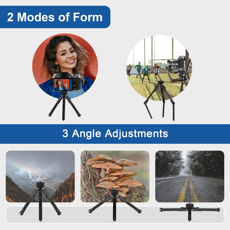 Lightweight and Portable: The mini tripod of course match for use on the desktop, the minimum height of 42mm/1.65” , the maximum height of 130mm/5.1” , the weight is only 162g/0.35lb, it is easy to carry when traveling, The longest 8.5-inch stand is only 5 inches long when folded, into the backpack occupies little space.