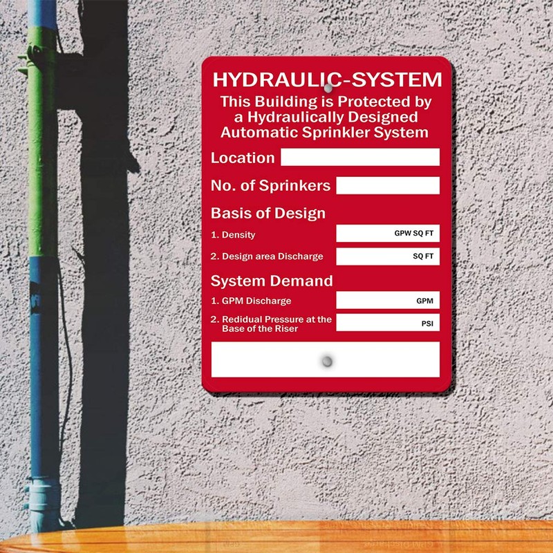 The text reads: hydraulic-system this building is protected by a hydraulic designed automatic sprinkler system location no. of sprinkers basis of design 1. density 2. design are discharge system demand 1. gpm discharge 2. redidual pressure at the base of the riser. Perfect for businesses looking for: All Over metal signs, cut signs, signs, wall signs, or yard signs. Make sure your message or instruction catches the attention and is being seen as well as respected. Also available in different shapes and sizes, you will always find the perfect fit for you!
