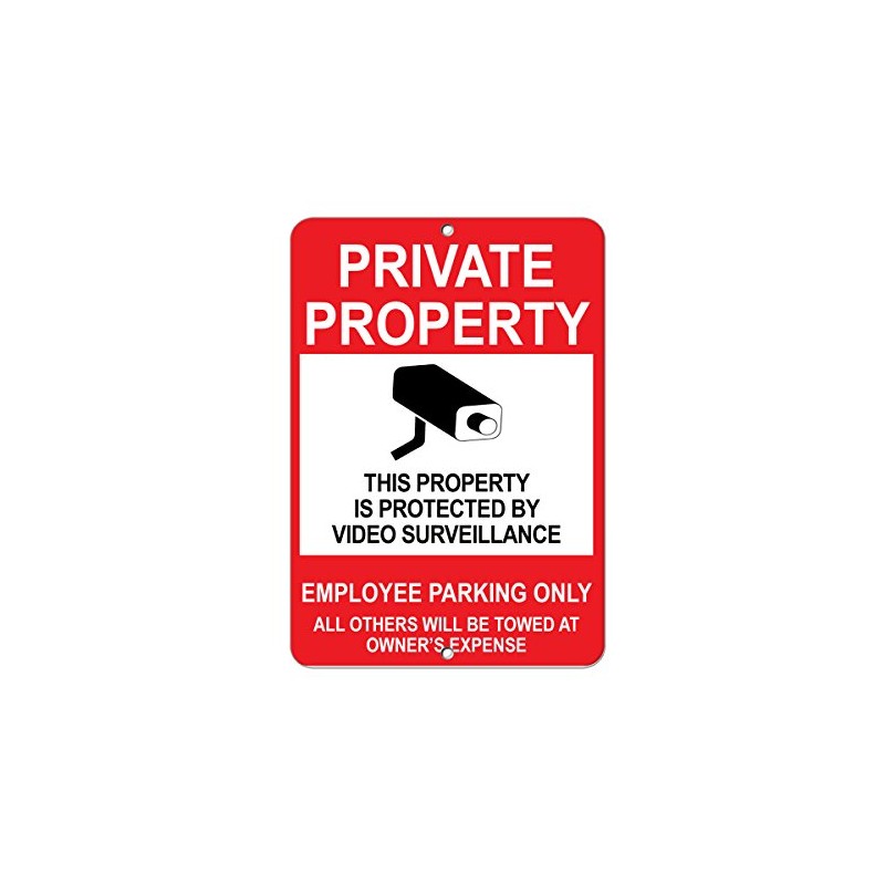 The text reads: private property this property is protected by video surveillance employee parking only all others will be towed at owner's expense. Perfect for businesses looking for: With Border metal signs, White cut signs, Red signs, wall signs, or yard signs. Make sure your message or instruction catches the attention and is being seen as well as respected. Also available in different shapes and sizes, you will always find the perfect fit for you!