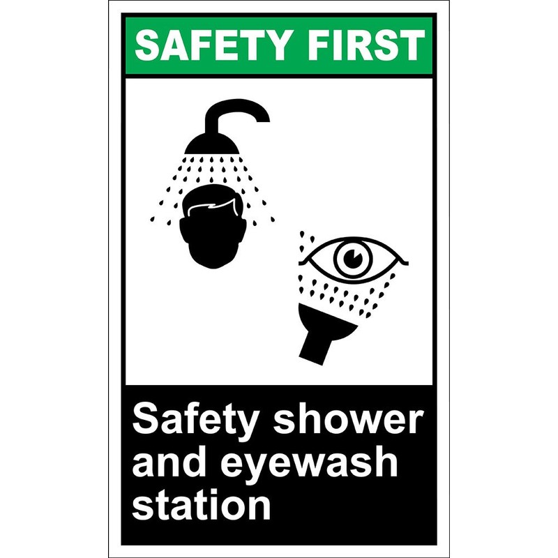 The text reads: safety first safety shower and eye wash station. Perfect for businesses looking for: With Border metal signs, White cut signs, Black signs, wall signs, or yard signs. Make sure your message or instruction catches the attention and is being seen as well as respected. Also available in different shapes and sizes, you will always find the perfect fit for you!