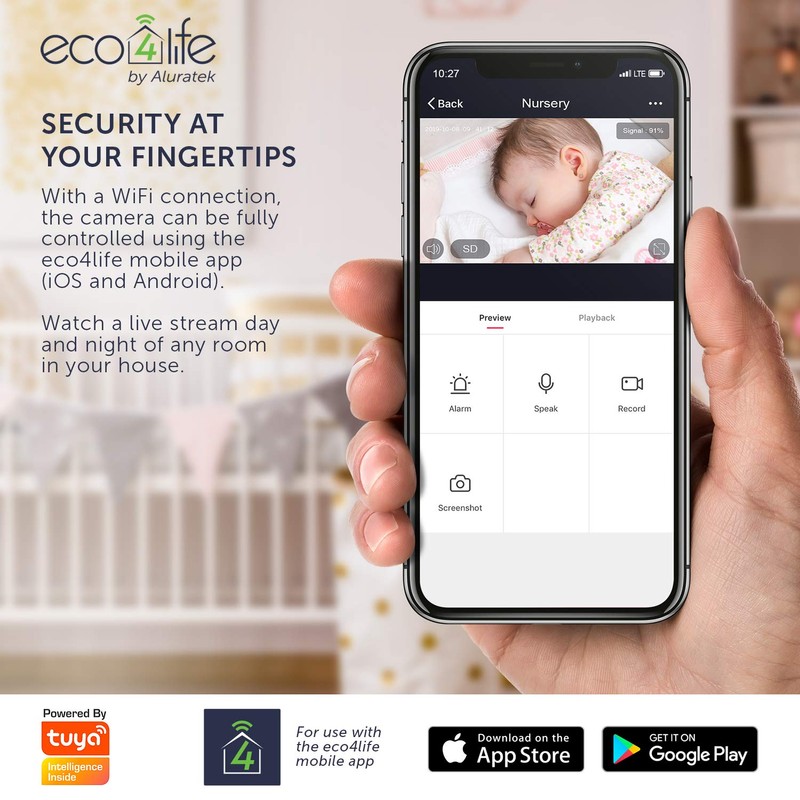• Connected 24/7 - Monitor your home with 24/7 surveillance. Using a Wi-Fi connection, the Smart Home Wi-Fi Security Camera can be fully controlled using the Eco4Life mobile app from any location Check-in on your yard, family members or pets whenever you please.