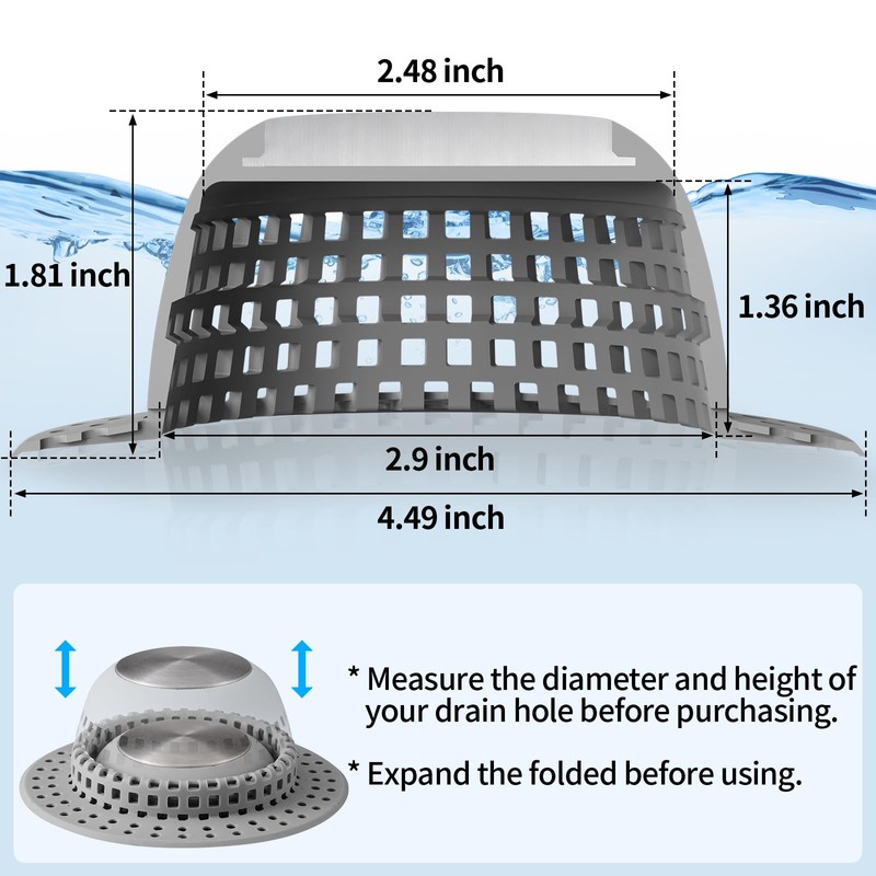 - Shower Drain Hair Catcher - Tall & dome design fits both flat and pop-up drains. Its outer diameter measures 4.49", inner diameter 2.9", inner height measures 1.36", fits most US standard drains.