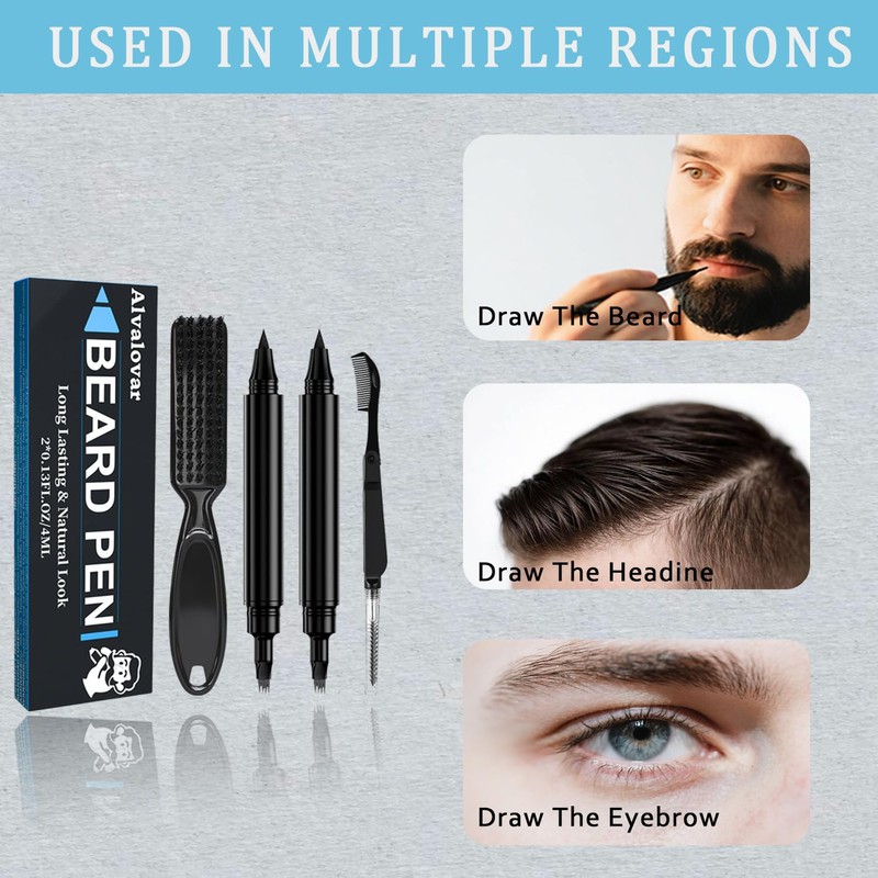 Alvalovar Beard Pen (2 pack) - Black Beard Pencil Filler For Men - Waterproof With Brush - Long Lasting, Natural Look Beard Pencil For Beard Definition