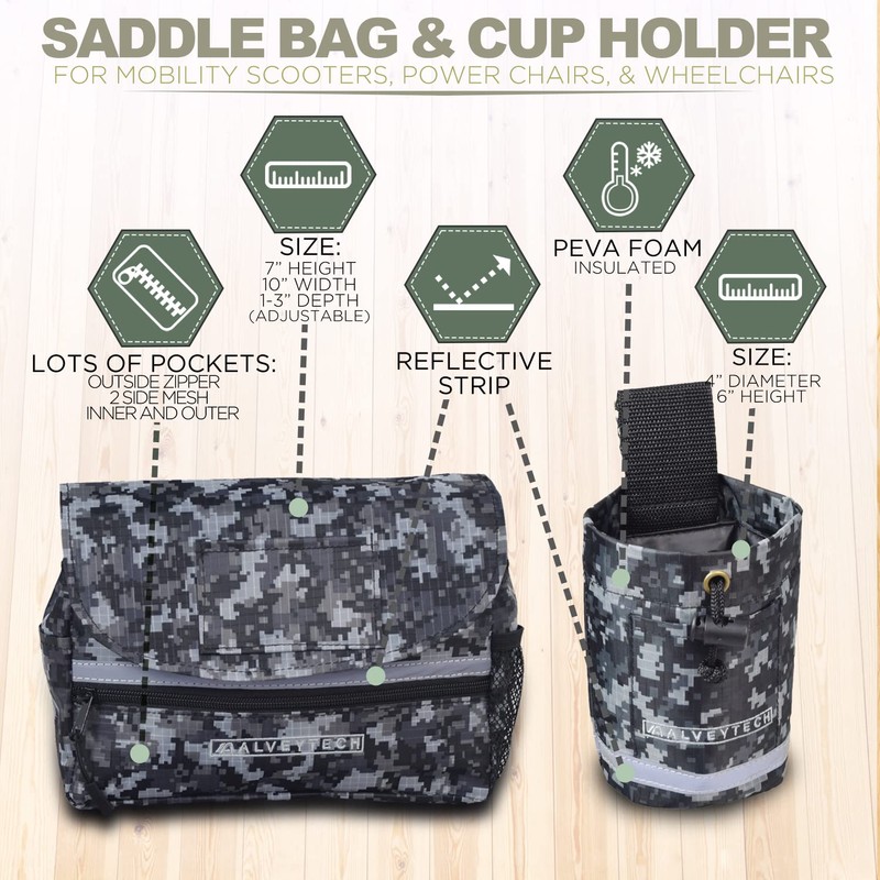 AlveyTech Saddle Bag & Cup Holder Combination for Mobility Scooters, Power Chairs, & Wheelchairs (Camo/Camo)