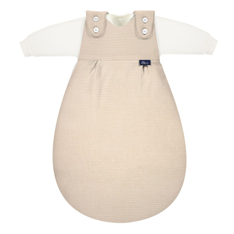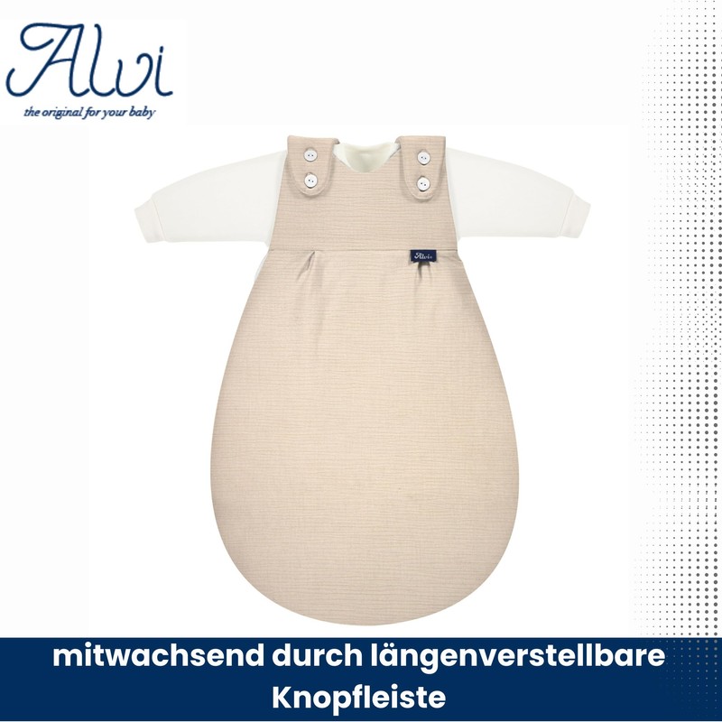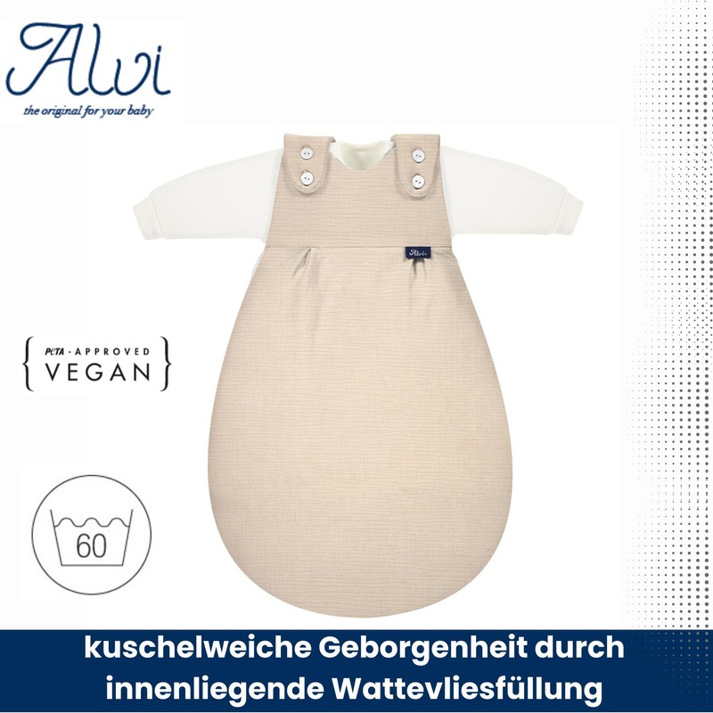 The Alvi sleeping bag, a must have for parents looking for the best for their newborns and toddlers. Our 2-piece set, consisting of inner and outer bag, offers the perfect combination of comfort and safety. The inner bag with a tog value of 0.8 and the outer bag with a tog value of 2.0 make this sleeping bag ideal for all year round, whether summer or winter. Made from 100% cotton, this baby sleeping bag offers breathability and skin friendliness, which are essential for sensitive baby skin. The all-round zip on the outer bag ensures easy on and off, while the inner bag with sleeves provides extra comfort. Alvis proven Baby-Mäxchen system ensures that your baby always stays in the optimal sleeping environment. This baby sleeping bag is suitable for newborns and babies from 0-3 months, but also available as a sleeping bag baby 6-12 months. With a washability of up to 60°, the sleeping bag always remains hygienically clean, but it is not suitable for tumble drying. This ensures that the material retains its shape and softness. The Alvi winter sleeping bag is particularly suitable for the cold months and ensures that your baby stays warm without overheating. Our baby sleeping bags are designed to improve your child's sleep quality. Trust in the quality of Alvi to ensure that your baby always sleeps safely and comfortably. Choose between a variety of options tailored to your baby's individual needs and experience the soothing effect of a high-quality baby sleeping bag.