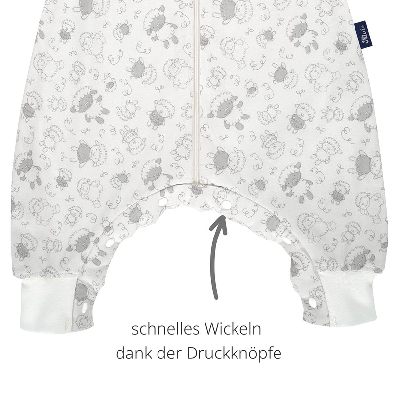 - Quick to put on and take off: the sleeping bag with feet can be easily opened with a zip (with chin guard). In the nappy area, press studs allow quick changing. The legs offer more freedom of movement than a ball sleeping bag.