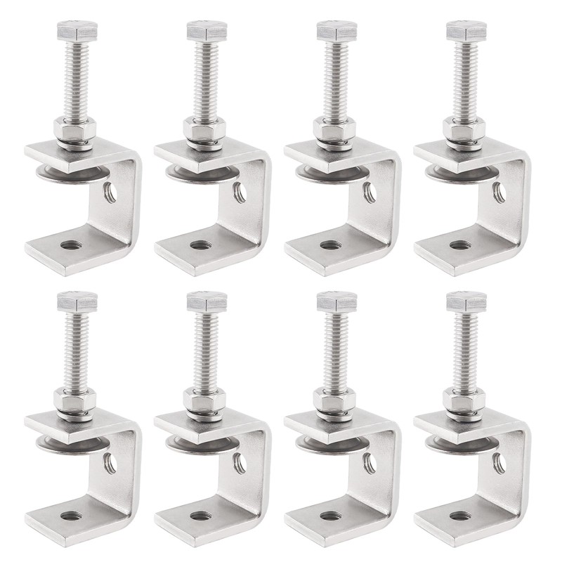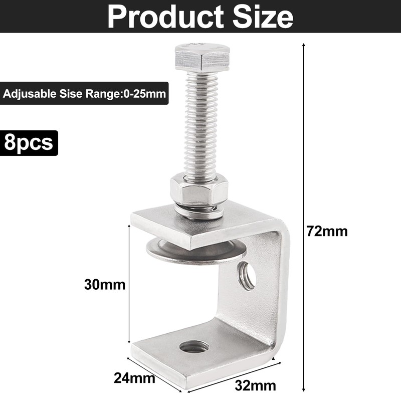 1. C clamp made of 304 stainless steel, it consists of a sturdy frame with M8 threaded holes on the side and bottom with adjustable positioning screws that can be easily attached to any desk and the clamped object is not easy to deform.