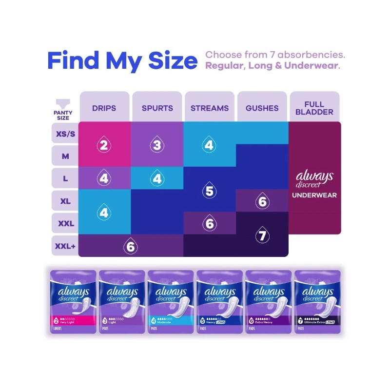 - FIND THE RIGHT PAD SIZE FOR YOU using the Always Discreet My Fit size chart