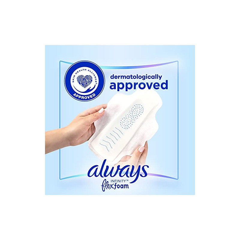 Always Infinity FlexFoam Pads Regular Absorbency feel like nothing and protect like nothing else. These FlexFoam sanitary pads are unbelievably flexible and thin so your pad moves with you, not against you. Make your next move with confidence, thanks to Zero Feel protection. With their upgraded design, Always Infinity FlexFoam pads feature form-fitting grooves that conform to your shape, and super absorbent holes that pull wetness away from your skin. Always’ driest top layer is breathable against your skin, so you can say goodbye to hot and stuffy. With Always Infinity FlexFoam pads, your period is the last thing on your mind.
