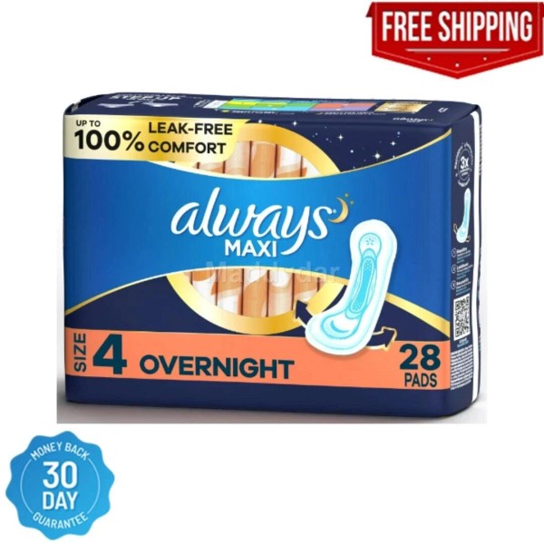 Always Maxi Pads Size 4 Overnight Absorbency Unscented without Wings, 28 Count