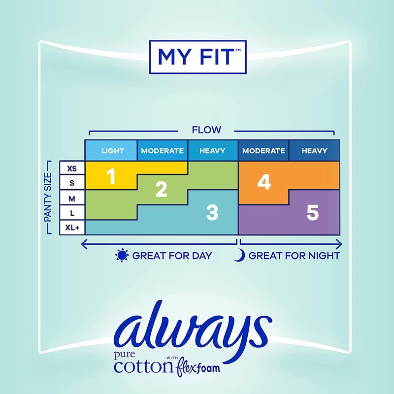 - No feel, no fail period protection is possible with Always Pure cotton with FlexFoam regular absorbency