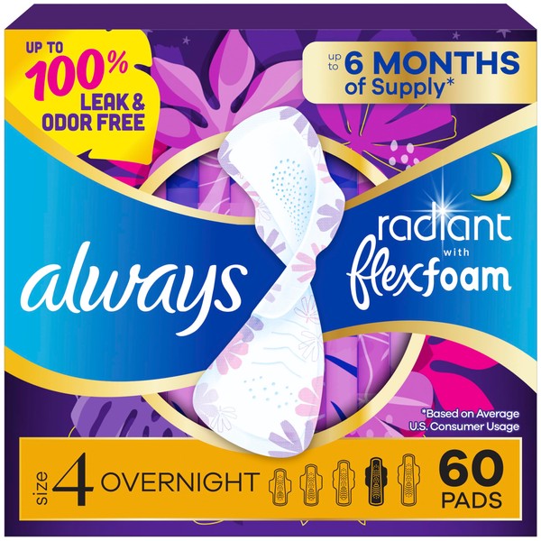 Always Radiant Feminine Pads for Women, Flexfoam Pads with Wings, Size 4, Overnight Absorbency, Lightly Scented, 60 Count (3 Packs of 20)