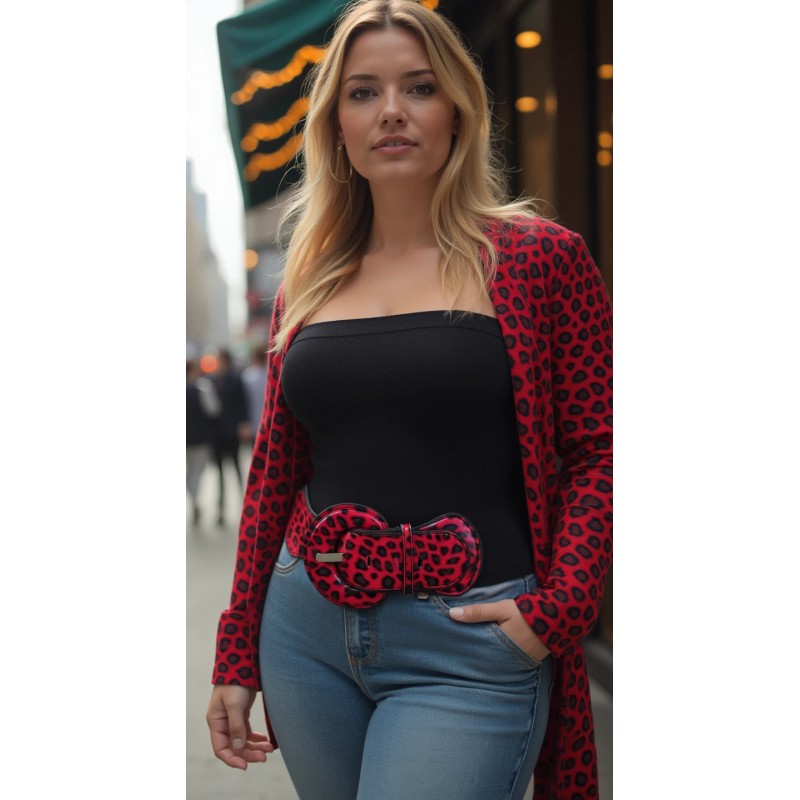 Make a bold statement with the Women Leopard Belt Fashion Cheetah Elastic. This animal print belt is the perfect combination of sassy and stylish, featuring a vibrant red, gray, and black faux leather animal print that adds a wild touch to any outfit. The elastic fabric waistband ensures a comfortable, adjustable fit, making it suitable for various waist sizes, from Medium - XL (30" - 45"). Whether you're dressing up for a casual outing or spicing up a night out, this panther print belt will give your look the perfect edge.