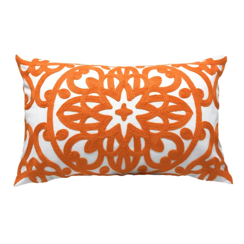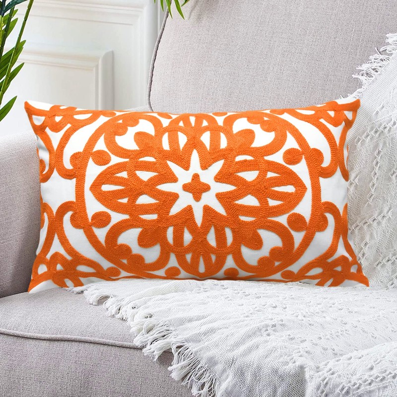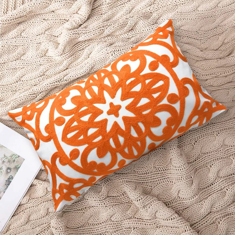 Alysheer Embroidered Lumbar Decorative Throw Pillow Cover 12"x 20", Classic Boho Mandala Embroidery Pattern Cotton Rectangular Cushion Case for Sofa Couch Living Room Bedroom (Bright Orange)
