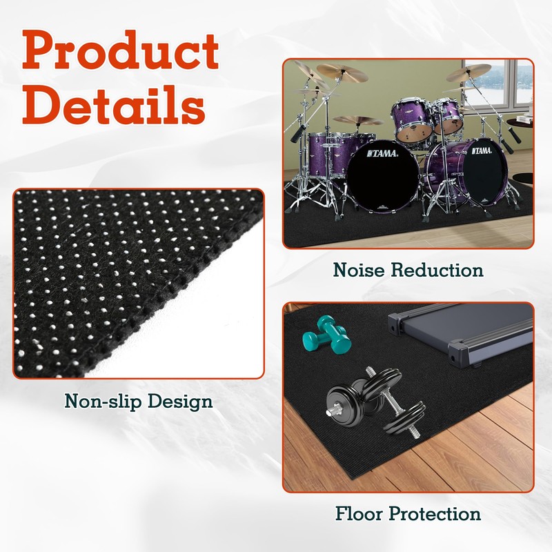 - Versatile Drum Carpet: Measuring 4 x 6 feet (120*180cm), this Carpet is ideal for most drum sets. It is suitable for stage performances, music studios, apartments, and can also be used under pianos, treadmills, and other equipment.