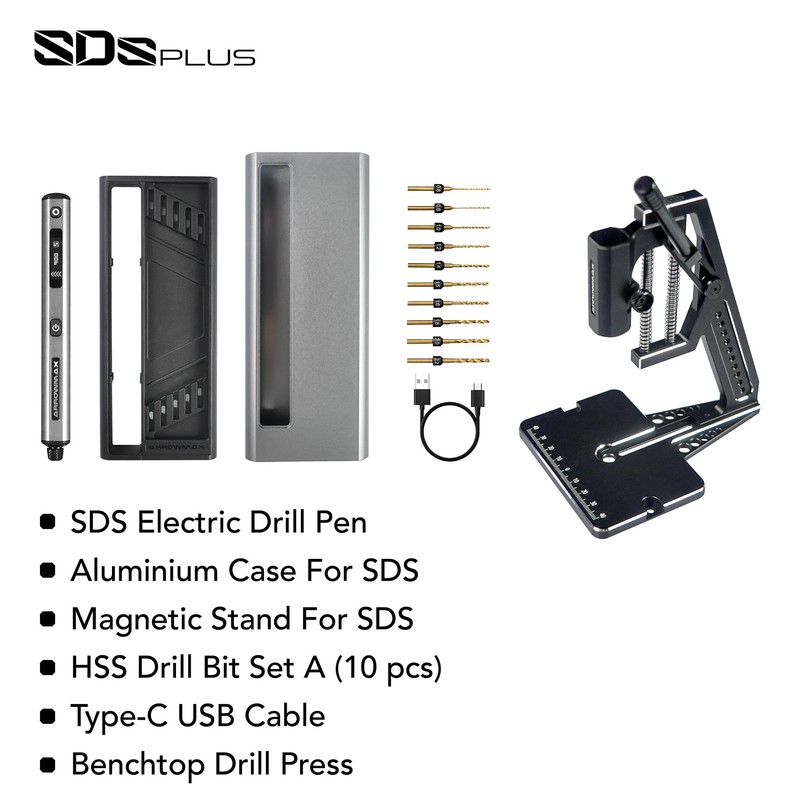 AM ARROWMAX 5-Speed Mini Electric Drill Pen with Benchtop Drill Press, 10 Small Drill Bits with Aluminium Box, OLED Display, LED Lights, 3/32-Inch Keyless Chuck (SDS ULTRA PLUS)