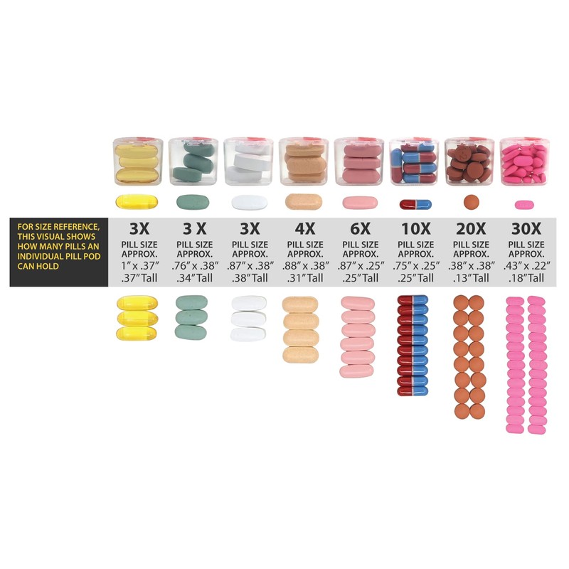 - Measurements - Medication Organizer Tray Size Approximately: 11”L x 4”W x 3/4”H - Individual Pill Pod Size Approximately: 1 1/8”L x 11/16”W x 1”H