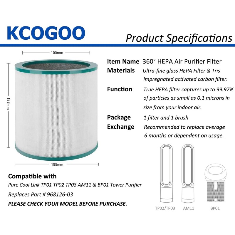 - 【Perfect Fit】This Filter compatible with Pure Cool Link TP01 TP02 TP03 AM11 and BP01 Tower Purifier, Replaces Part# 968126-03 (PLEASE CHECK YOUR MODEL BEFORE PURCHASE).