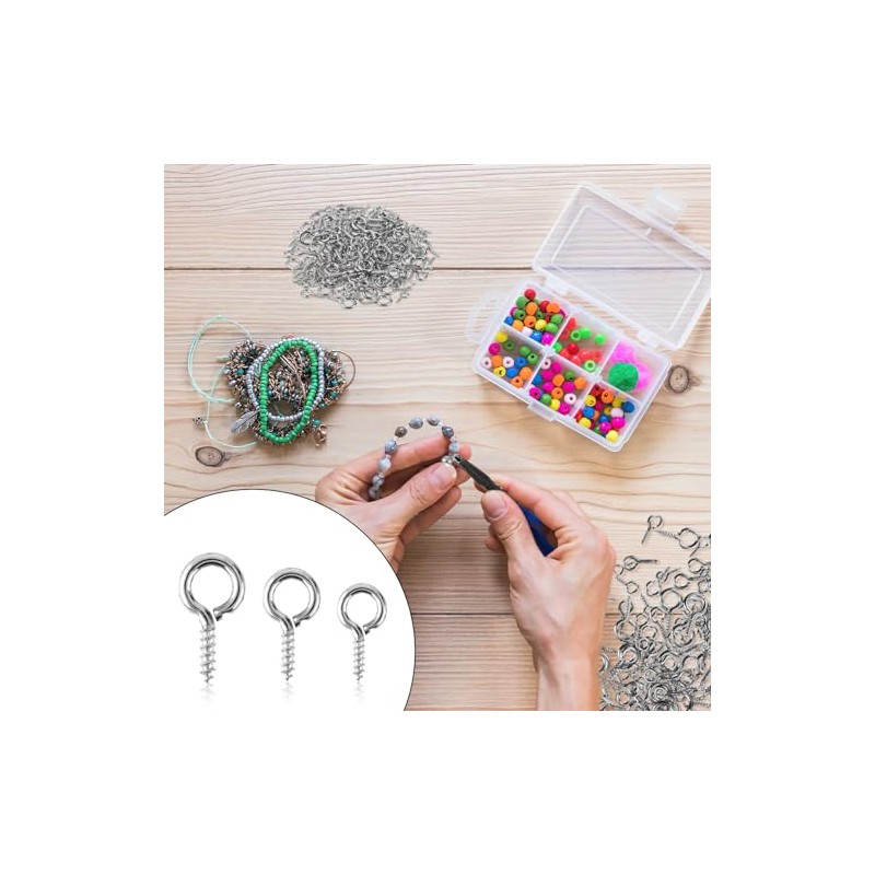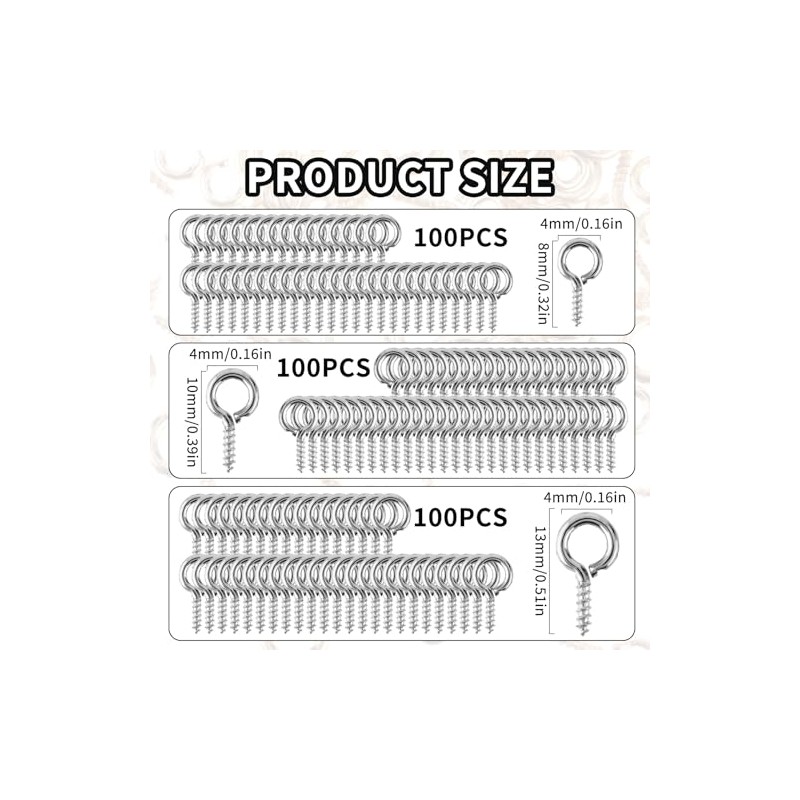 - 3 Different Sizes: You will get 300 screw eye pins. With 100 pieces in each of the three different sizes (13mm/0.5in, 10mm/0.4in, 8mm/0.3in), sufficient quantity, classic colors, and different sizes of eyelet screws to meet your daily needs for making different DIY crafts, is the necessary parts in making small pieces of jewelry, such as bracelets, necklaces, earrings, anklets, and many ornaments.