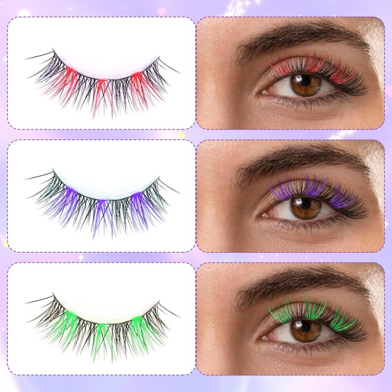 - Various Occasions A variety of choices are perfect for parties, Valentine's Day, Halloween masquerades, etc. You can also get different eyelash styles to match your everyday look, e.g. classic round eyelashes, natural, sweet half eyelashes or coloured eyelashes. Whether you are an experienced professional or just starting to experiment with false eyelashes, our coloured cluster eyelashes are easy to apply.