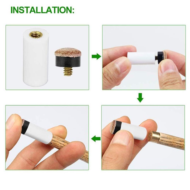 The billiard replacement screw on the tips with pool cue stick ferrules is easy to replace and install without our adhensive or glue, just unscrew the old tip and screw in the new one, please screw the tip also tightly when you replace it.