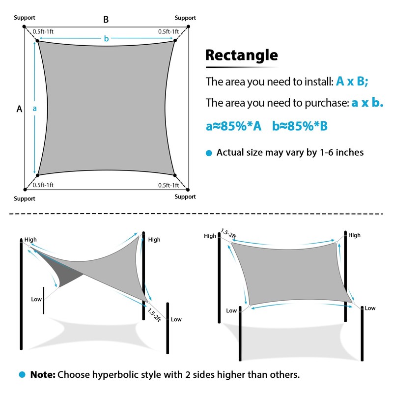 • Installation & Measurement: Shade sail measurements are taken from D-ring to D-ring. Leave a 1.5 to 2-foot gap during installation for proper tension. A ±4-inch deviation may occur due to material characteristics
