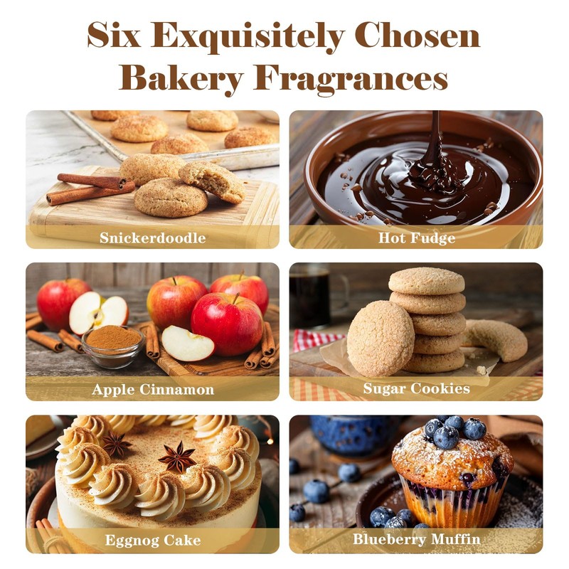 - 6 Delectable Bakery Scents: Captures the warmth and comfort of freshly baked treats, this set brings the sweet, comforting aromas of the kitchen into your daily life; Fragrance oils include Apple Cinnamon, Sugar Cookies, Snickerdoodle, Eggnog Cake, Blueberry Muffin, Hot Fudge