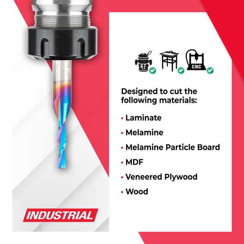 - IDEAL FOR: The spiral router bit is used for cutting the following materials: Laminate, Melamine, Melamine Particle Board, MDF, Veneered Plywood, and Wood