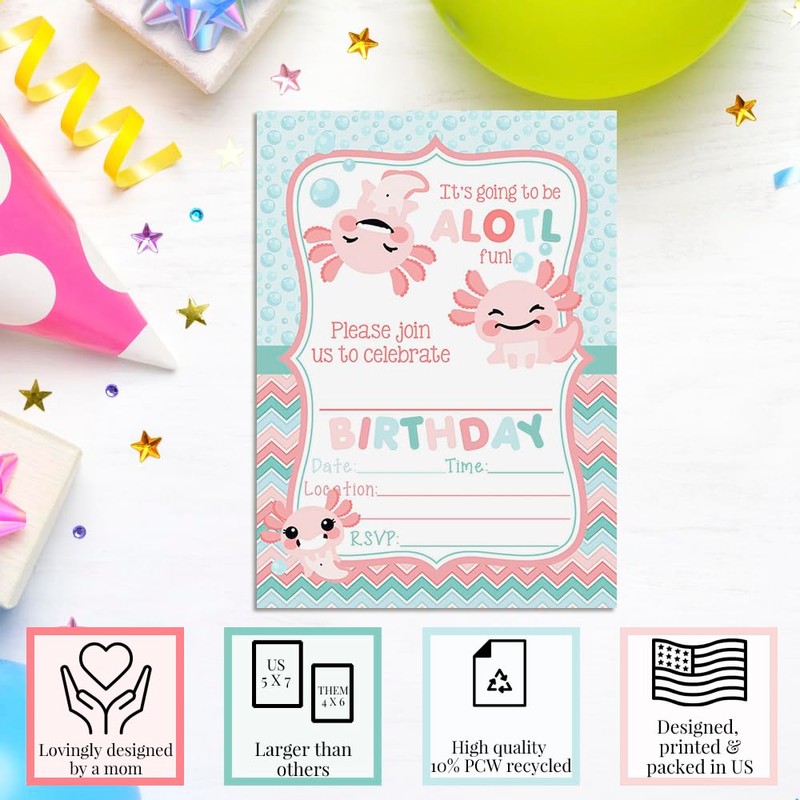 - Awesome Quality: Forget smaller, chintzier cards printed on flimsy paper. At 5"x7" your Axolotl Invites are bigger & sturdier than most. Plus, they're printed on 80# stock for ultra-durability.