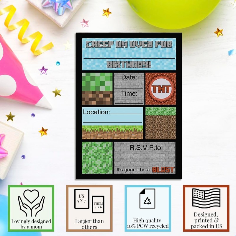 - Fill-In Spaces for B-Day Details: Fill-in spots give you plenty of room to write your child's name & age, party time & location, plus how to RSVP. Your Pixel Miner party will be a hit, it's everyone's favorite Mining Game!