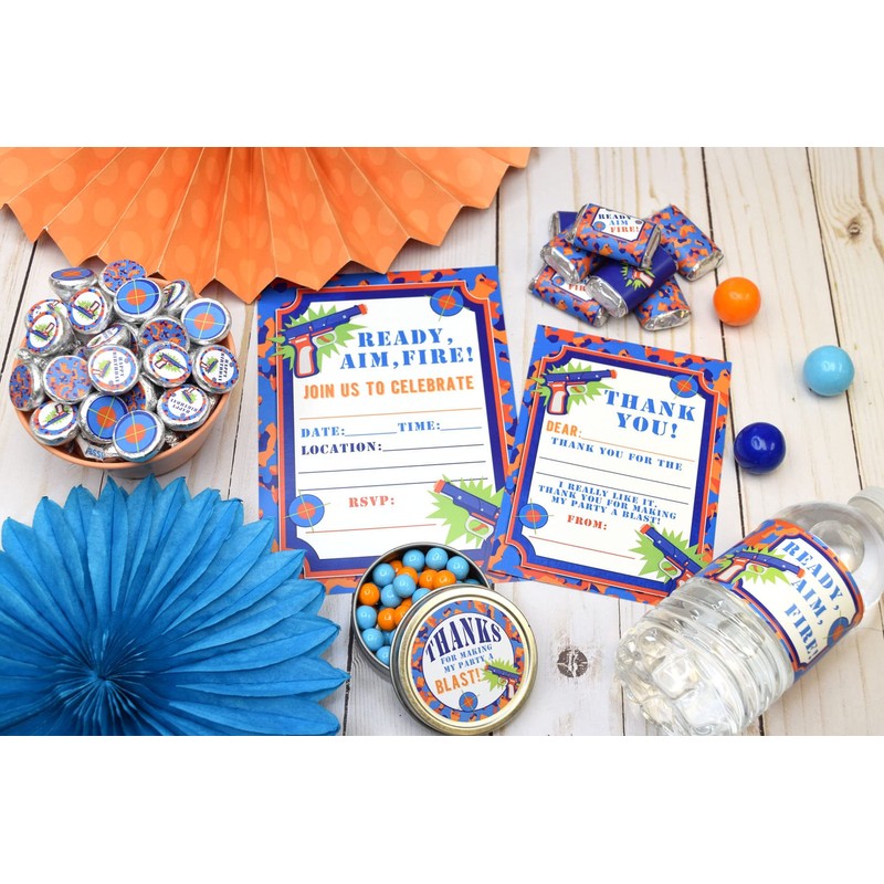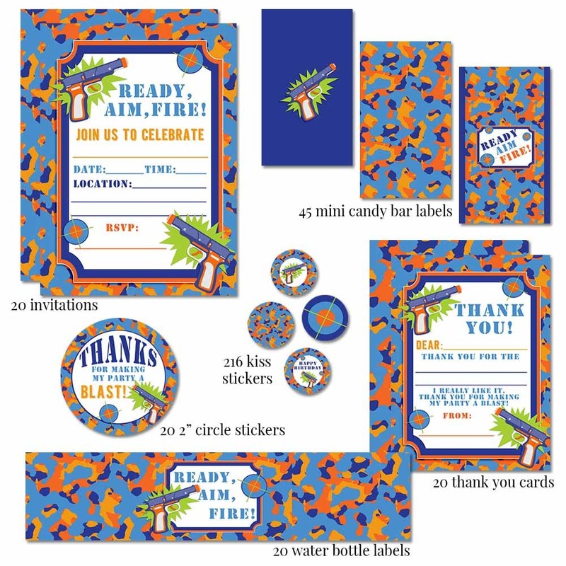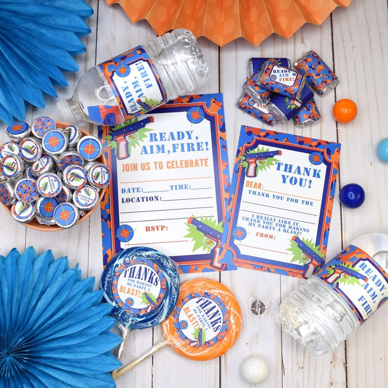 Amanda Creation Deluxe Dart Gun Birthday Party Bundle Includes 20 Invitations & Thank You Cards & Envelopes + 2 Sizes of Stickers, & Water Bottle Labels!