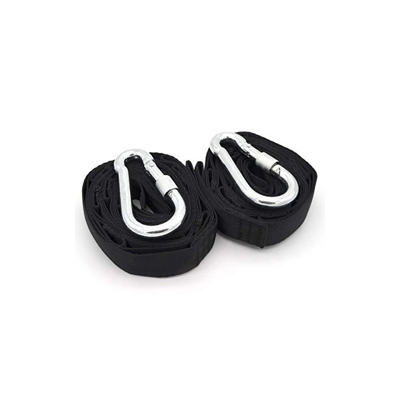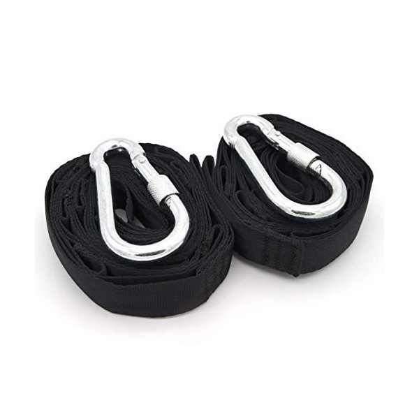 - Mounting set for indoor and outdoor use – set of 2 swing suspension with strap in black – indoor and outdoor. Each tree attachment approx. 280 x 2.5 cm, plus 2 carabiner hooks with screw cap made of steel.