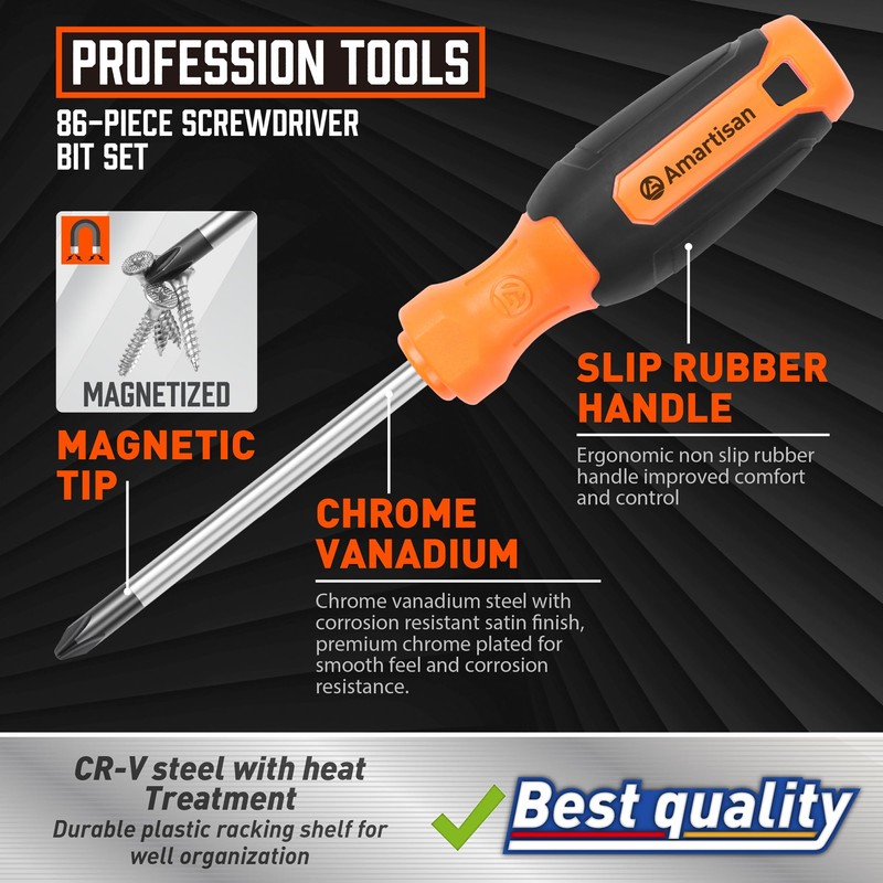 Amartisan 86-Piece Magnetic Screwdrivers Set with Case, Includs Slotted, Phillips, Hex, Pozidriv,Torx and Precision Screwdriver Set, Magnetizer Demagnetizer Tools, Tools for Men
