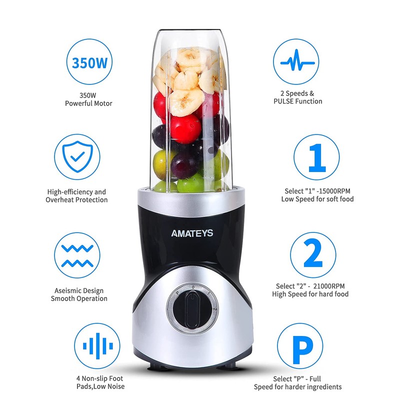 - Grinding & Blending: 2-leaf flat blade and 4-leaf cross blade combine the grinder and mixer together, realize functional diversification. Amateys 350W grinder and blender set can not only make smoothies, vagetable & fruit juices ,milkshakes, jam, baby food, but also grind coffee beans, spices and nuts into powder.