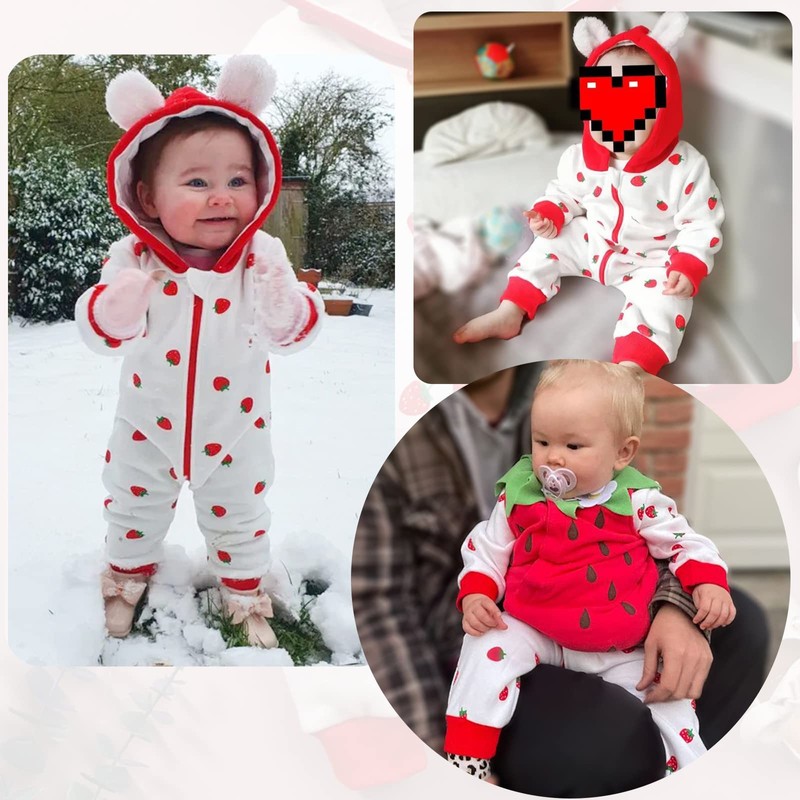 • Winter baby girl clothes: cute bear hooded jumpsuit printed with strawberry patterns all over. lovely vibrant design, lighting the winter. baby girl winter outfits keep warm in the cold outside, great winter baby essential