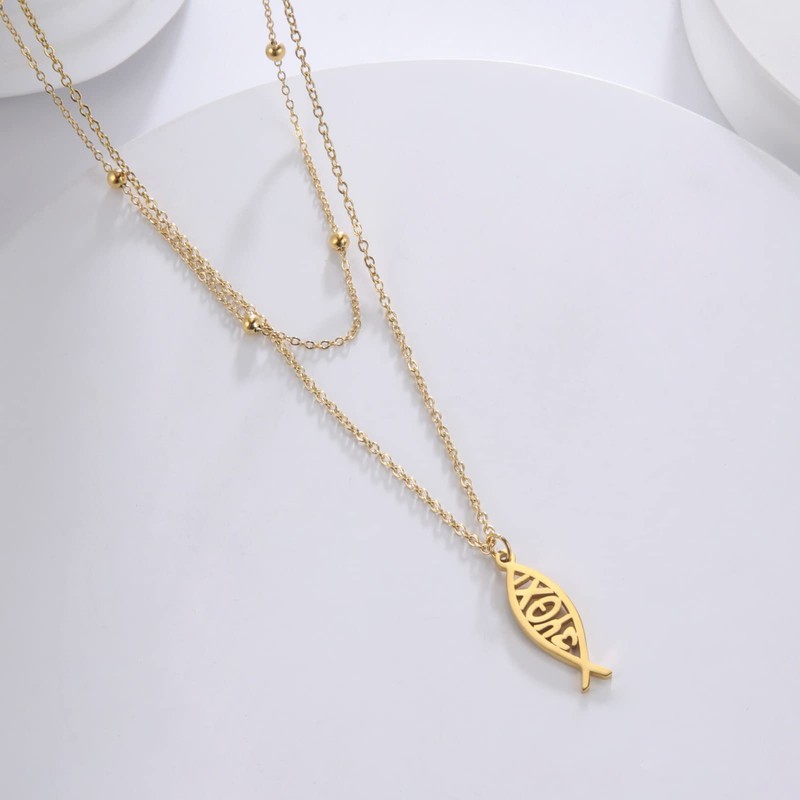Amaxer Ichthys Necklace Cross Jesus Christ Angel Love Fish Christian Symbol Charm Pendant Necklace for Women Christian Jewelry stainless Steel Double Layer Beaded Necklace (Fish-G)