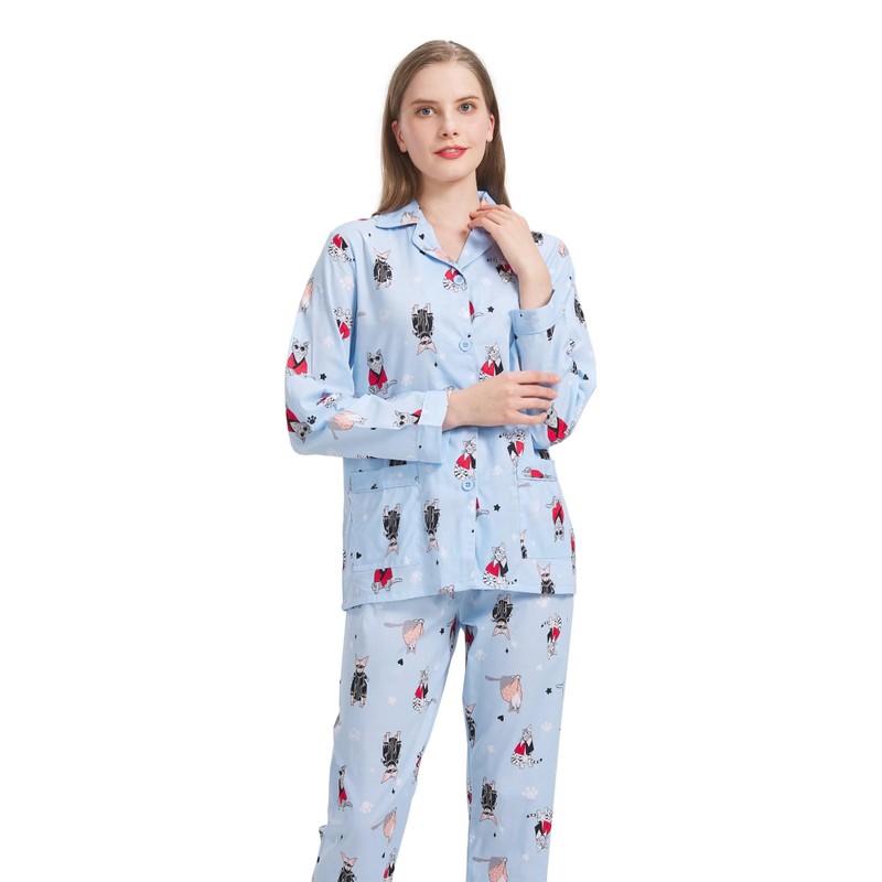 Amaxer Women's 100% Cotton Pajama Set For Women Long Sleeve Soft Button Pajamas Elastic Drawstring PJs, Cute Cat on Blue, Medium