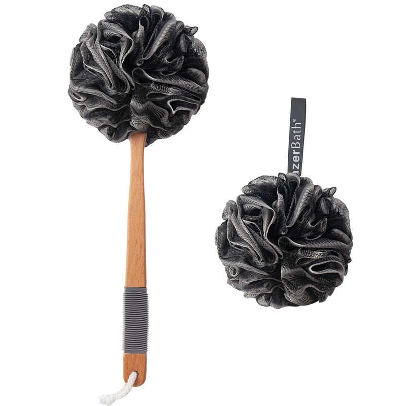 AmazerBath Shower Sponge Loofah Back Scrubber, PE Soft Mesh Loofah Body Scrubber with Long Wooden Handle, Bath Sponge for Men Women (Black)