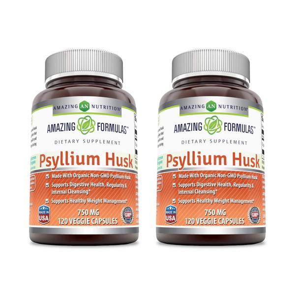 Amazing Formulas Psyllium Husk 750mg 120 Veggie Capsules Supplement | Non-GMO | Gluten Free | Made in USA | Suitable for Vegetarians | 2 Pack