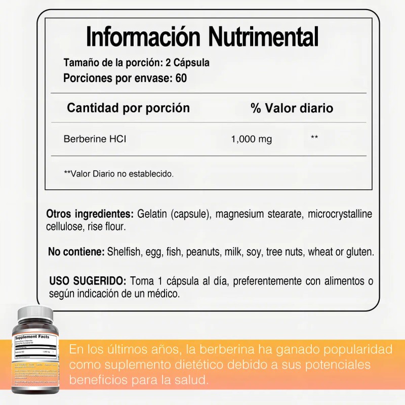 Ingredientes: Berberine HCI 1,000mg. Consulta la tabla nutricional para mayor información.