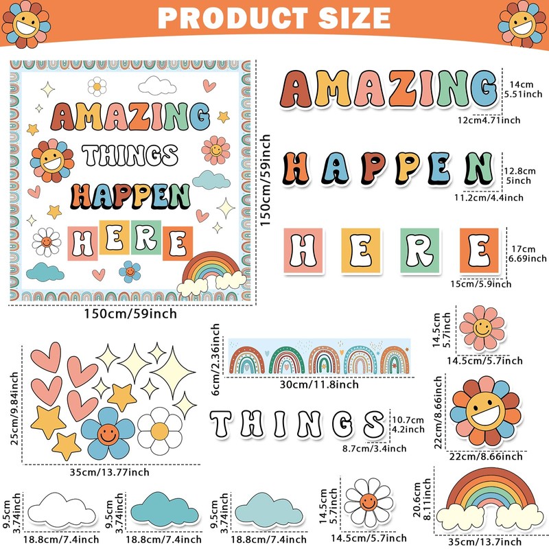 - What you can get: The amazing things happen here bulletin board consists of 32 pattern cards, including 23 plain text patterns and 9 cartoon patterns. Additionally, this amazing bulletin board decoration set includes 7 sheets of adhesive dots. Our boho bulletin board decoration set vary in size, ranging from 1.7 inches to 13.7 inches (4.4cm to 35cm). With an ample quantity and ideal size, it fulfills your requirements for classroom decoration.