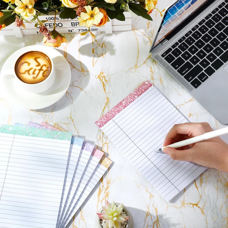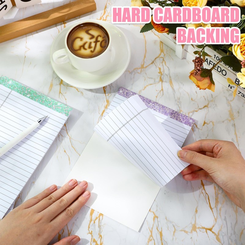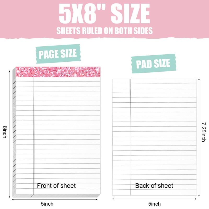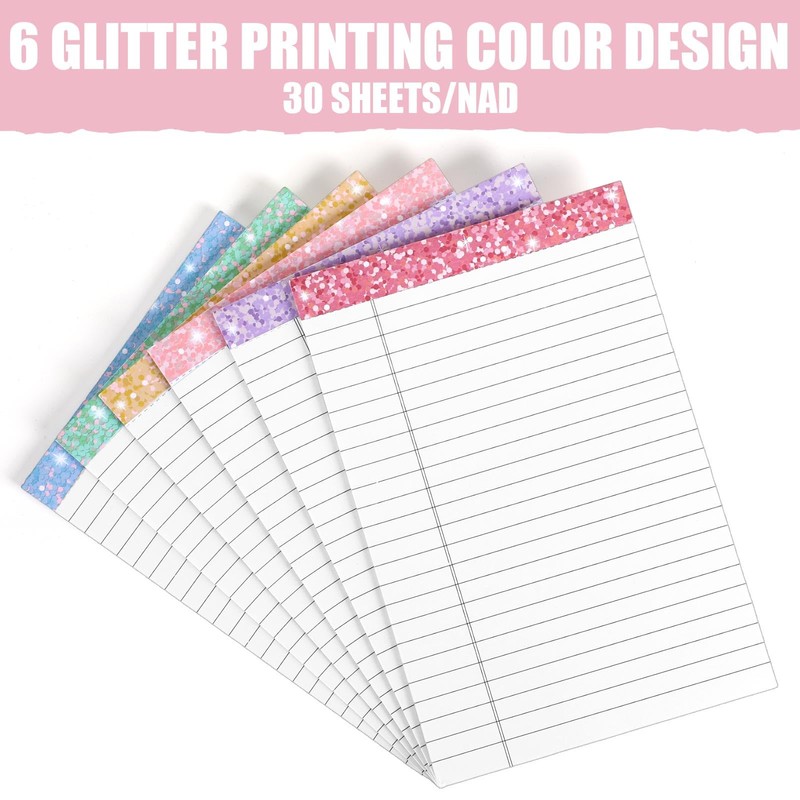 - Quality Material: legal pads 5 x 8 inch glitter feature 80 gsm thick paper with black lines, providing ample space for your notes; The smooth, colored paper allows your pen to glide across the page, resisting ink bleeding and show through; These notepads are thicker than average for a luxurious writing experience with minimal ghostings