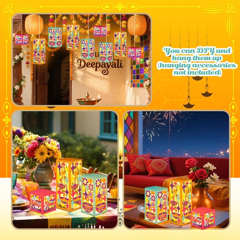 - LED Diwali Themed Designs: these happy Diwali table decorations incorporate ethnic elements such as oil lamps, colorful stars, stylized flowers, and "Happy Diwali", which symbolize the victory of light over darkness; Each decoration is equipped with LED lights and battery boxes, which are lit from the inside, creating a warm, lively and festive atmosphere, inviting people to celebrate and cherish traditions