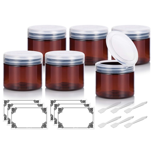 Amber PET Plastic (BPA Free) Refillable Low Profile Jar with Clear Natural Flip Top Cap - 6 oz (6 pack) + Spatulas and Labels